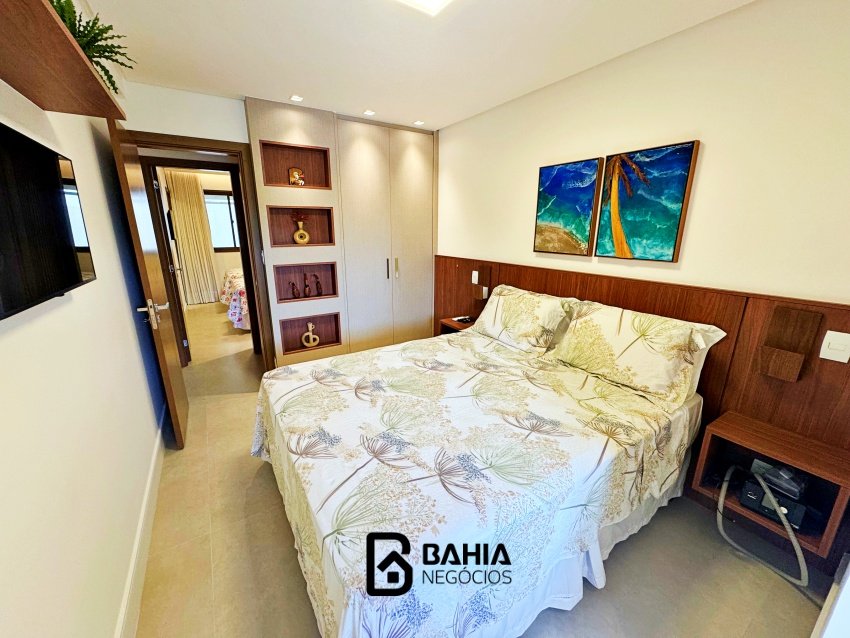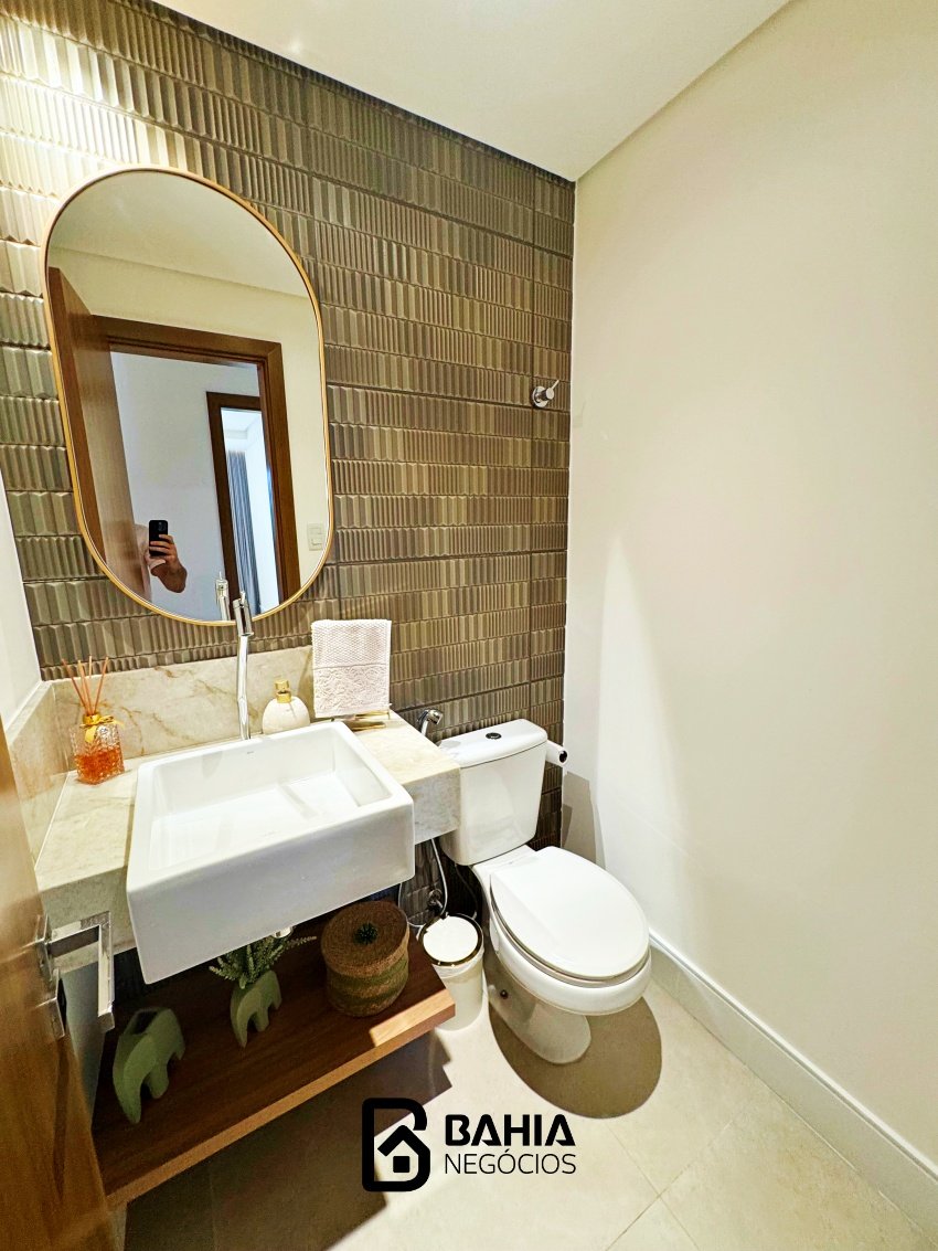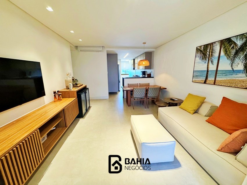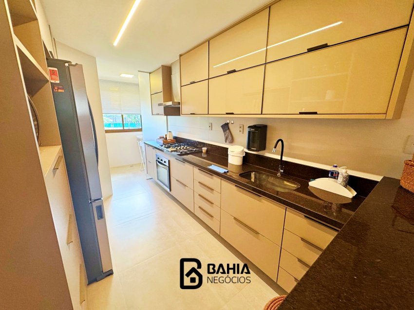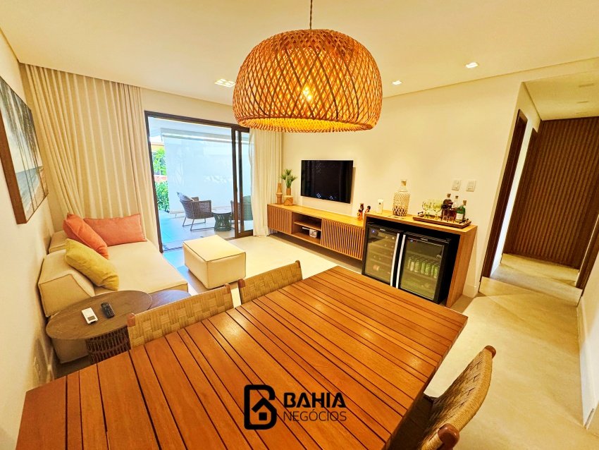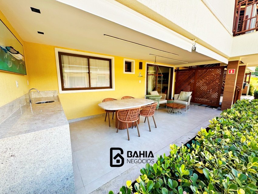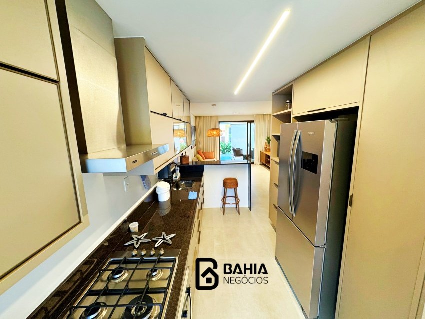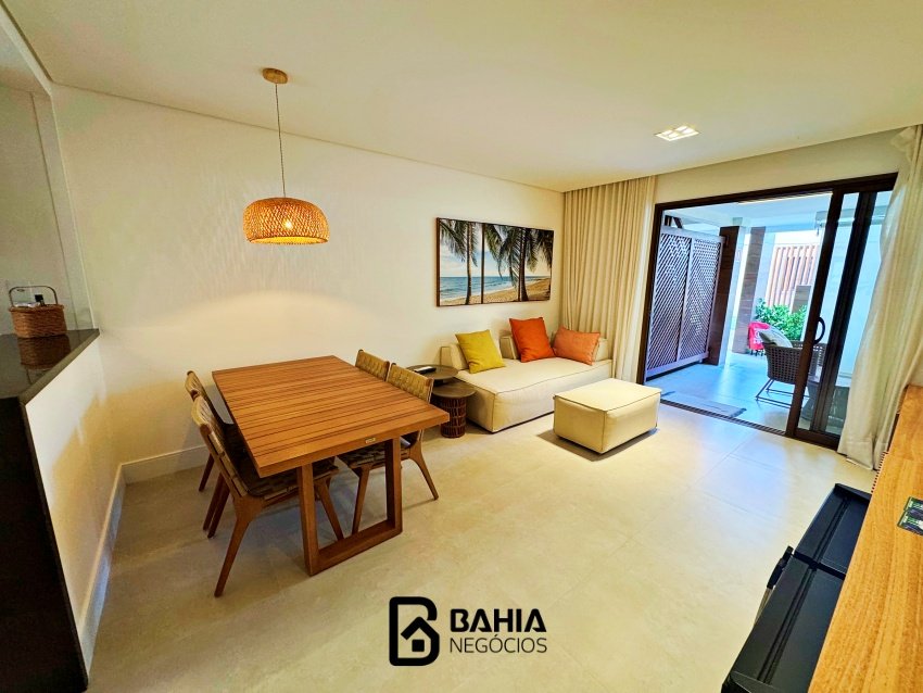 Village 100% mobiliado e decorado, térreo, com 124m² de área privativa, contendo varanda nascente, sala e cozinha integrados, lavabo, 3 suites amplas e duas vagas de garagem.
